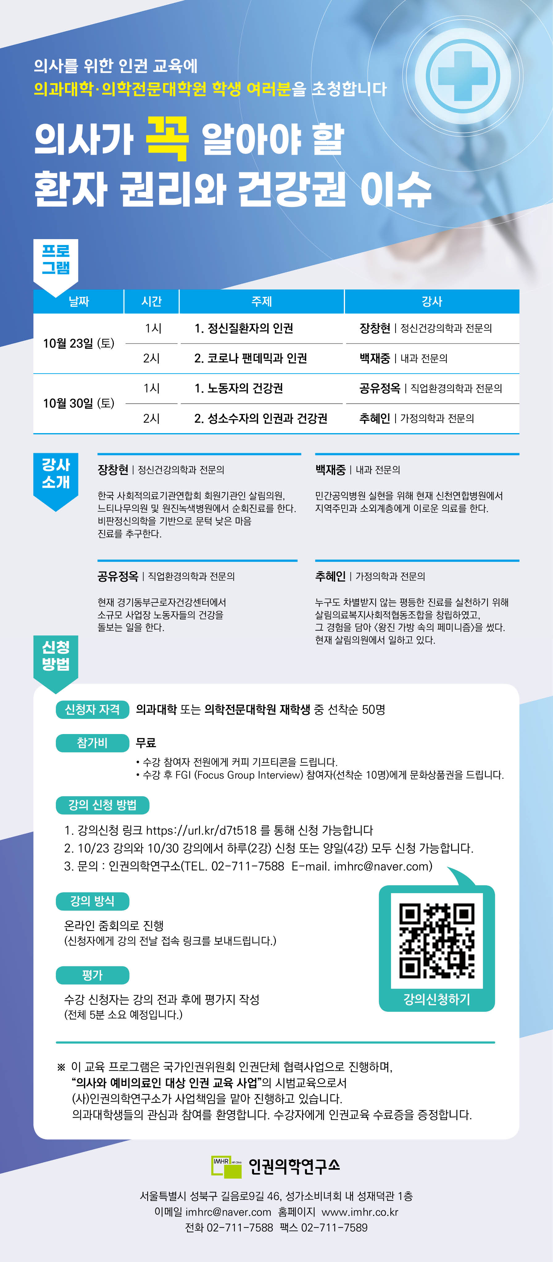 이번 10월, 인권의학연구소에서 예비의사를 대상으로 교육강좌를 준비하고 있습니다.