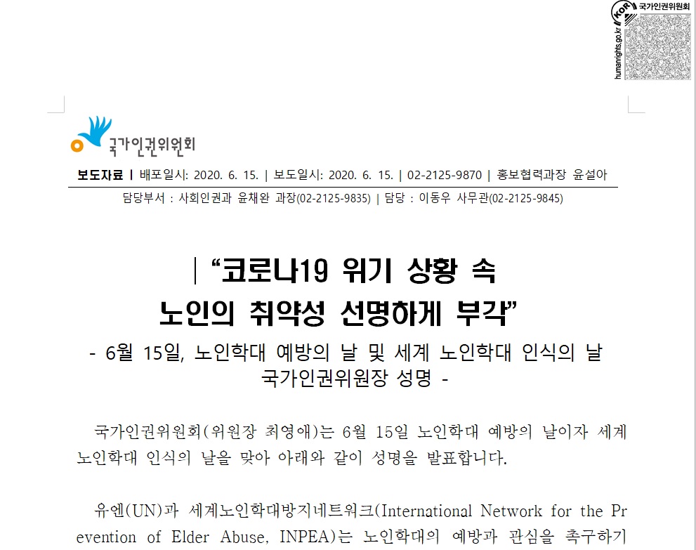 - 6월 15일, 노인학대 예방의 날 및 세계 노인학대 인식의 날 국가인권위원장 성명 -