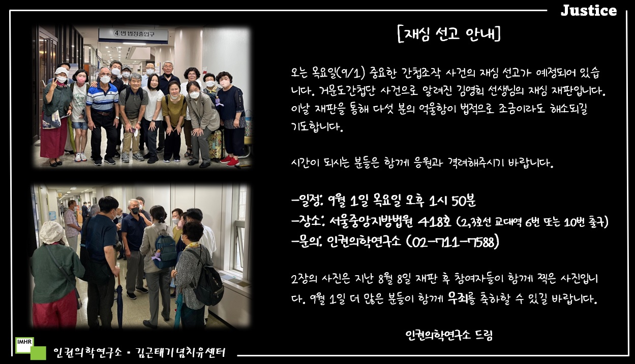 이번 재판을 참여하면서 여전히 검찰이 재심이 개시된 국가폭력 사건의 피고인을 대하는 비인간적인 처사를 분명하게 목격했습니다. 그 과정에서 매번 피고석에 앉아 1시간이 넘게 눈물만 흘렸던 국가폭력 피해자분들을 그저 바라볼 수밖에 없었습니다.