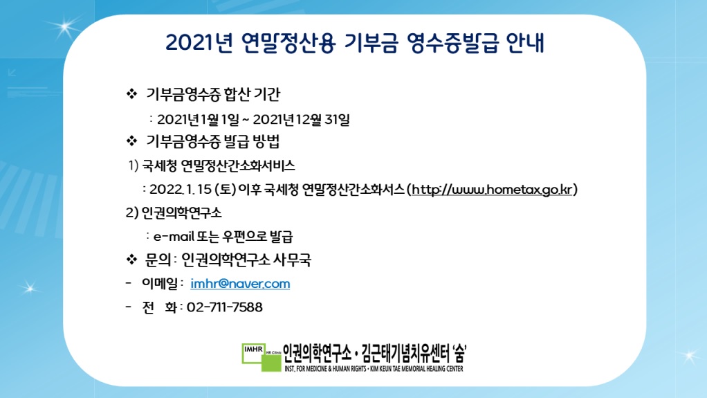 코로나-19로 모두가 힘들었던 지난 해에도 변함없이 지지해주시고 후원해주셔서 감사합니다. 새해에도 인권의학연구소·김근태기념치유센터 ‘숨’은 인권피해자를 돕고 사람을 진정 존중하는 건강한 사회를 만들기 위해 더욱 노력하겠습니다.