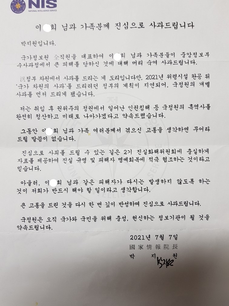 [국가의 사과] 국정원, 과거사 사건 피해자에게 ‘사과 서한’을 보내다.