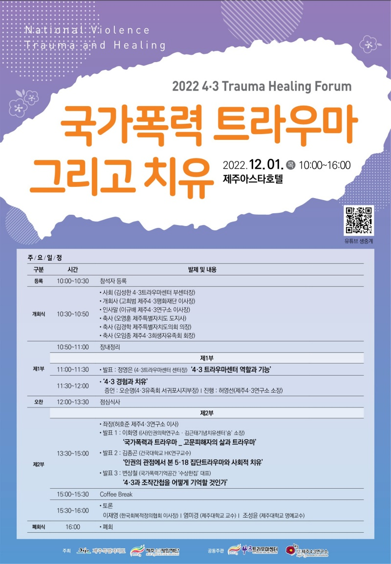 다가오는 12월 1일 오전 제주아스타호텔에서 ‘국가폭력 트라우마 그리고 치유’를 주제로 ‘4·3 트라우마 치유포럼’을 개최한다. 이번 포럼은 제주도와 제주4·3평화재단이 공동 주최하고 4·3트라우마센터와 제주4·3연구소가 공동 주관한다. 본 포럼의 2부에서 인권의학연구소 이화영 소장은 ‘국가폭력 트라우마-고문피해자의 삶과 트라우마’를 주제로 한 발표를 맡았다.