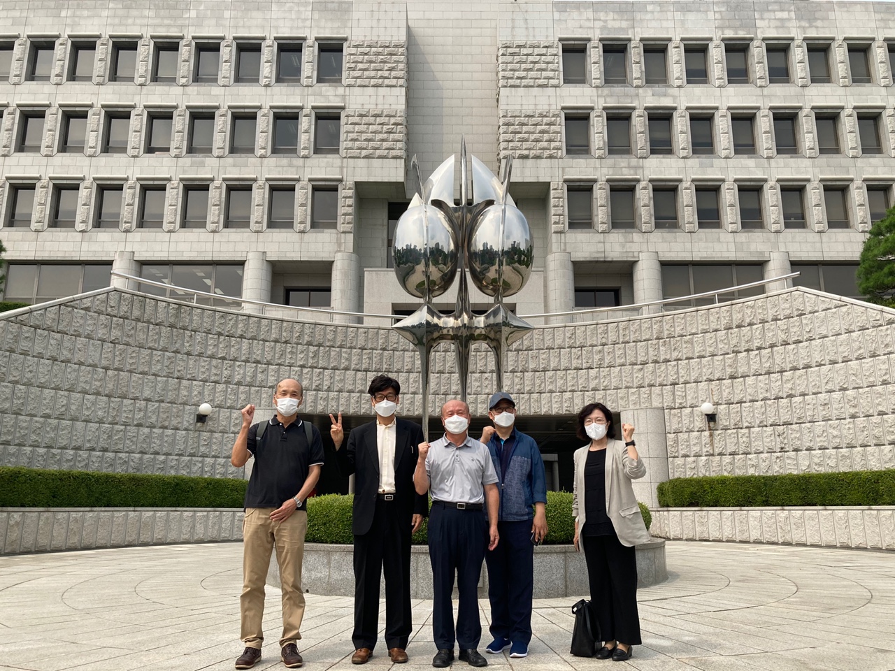 <사진-2> 지난 7월 29일, 대법원에서 무죄 판결을 받은 후 재판에 참석한 분들이 함께 사진을 찍고 있다. 김성만 선생(왼쪽에서 두 번째) 혼자 'V'를 하고 있다.
