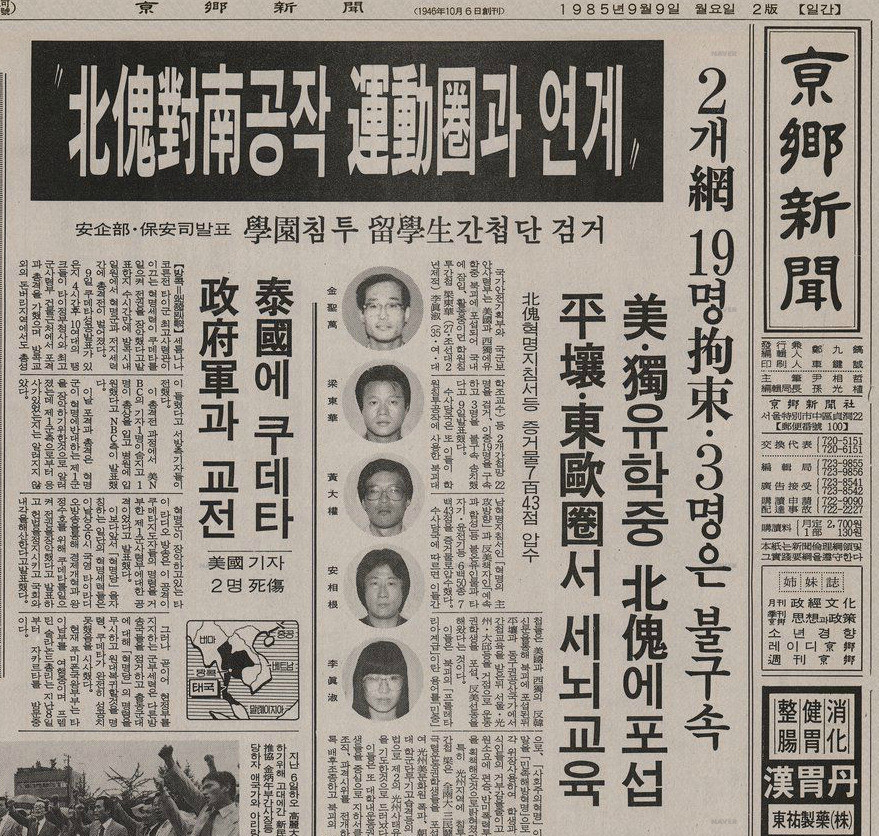 이러한 정치적 역학 속에서 전두환의 국가안전기획부(안기부)는 외부의 적을 상정해 내부의 단결을 도모하려는 전통적인 정치적 술수를 쓰고자 했다. 그게 바로 1985년 9월 9일 발표된 ‘구미유학생 간첩단 사건’이다. 당시 안기부의 발표에 따르면, 양동화, 김성만, 황대권 등이 미국 유학 중 북한 공작원에 포섭된 뒤 국내에 잠입해 학생들의 반정부 폭력시위를 주도하면서 간첩활동을 했다는 것이다.