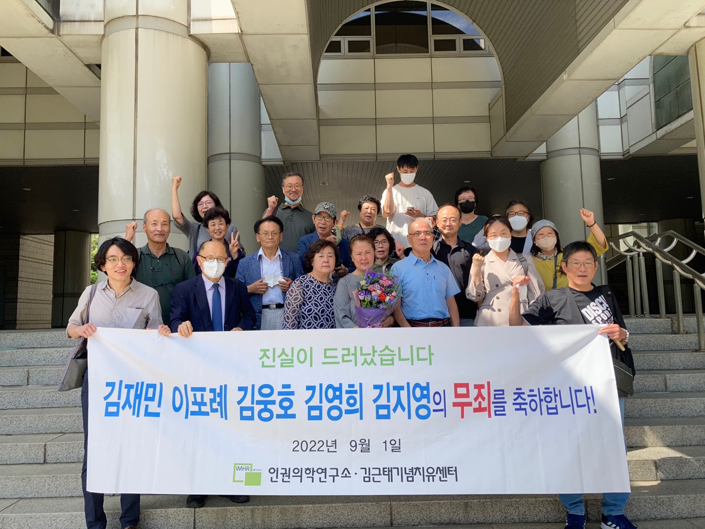 이 같은 소회를 마치고 정진아 부장판사는 이미 돌아가신 2분의 피고인과 재판에 참석한 3명의 피고인들 모두 무죄라고 판결했다. 3명의 피고인들은 무죄라는 말이 나오자마자 45년 동안 참았던 울음이 터져 나왔다. 그리고 피고인들과 같은 국가폭력 피해자로 가슴 졸이며 재판을 동행했던 참석자들도 방청석에서 너나할것 없이 눈시울을 붉혔다.