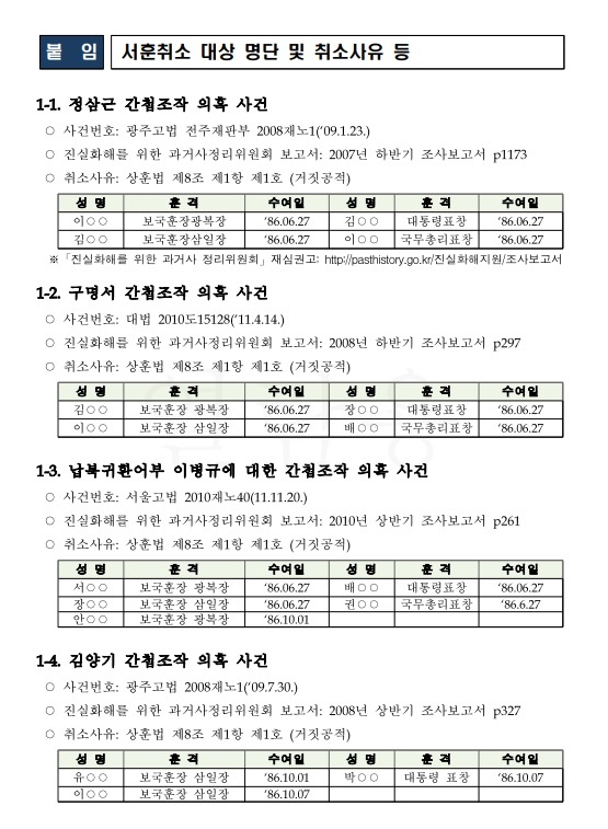 - 2018.07: 행안부는 1980년대 간첩조작사건을 비롯해 부산 형제복지원 인권침해사건, 5·18광주민주화운동 진압 관련자 등 53명·2개 단체에 수여된 56점의 훈·포상을 취소했다고 보도자료를 통해 발표