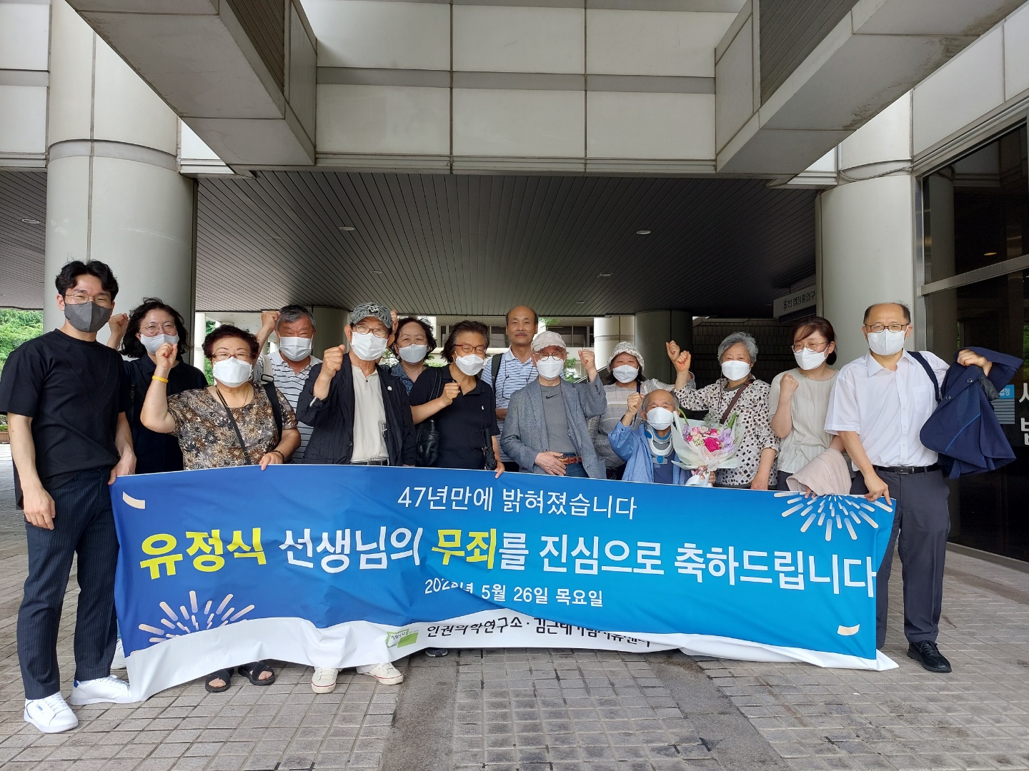 지난 7월 7일, 서울고등법원에서 또 하나의 역사가 바로잡혔다. 이 뒤틀린 역사를 바로잡는데 무려 47년이 걸렸다. 1975년 간첩조작 사건의 피해자가 되어 무려 23년의 시간 동안 감옥에 갇혀 억울한 세월을 보내야 했던 유정식 선생이 재심에서 비로소 무죄를 받았다. 이 역사적인 현장에 많은 동지들이 함께 참석해 유정식 선생의 무죄를 축하했다. (아래 사진을 참고해주세요.)