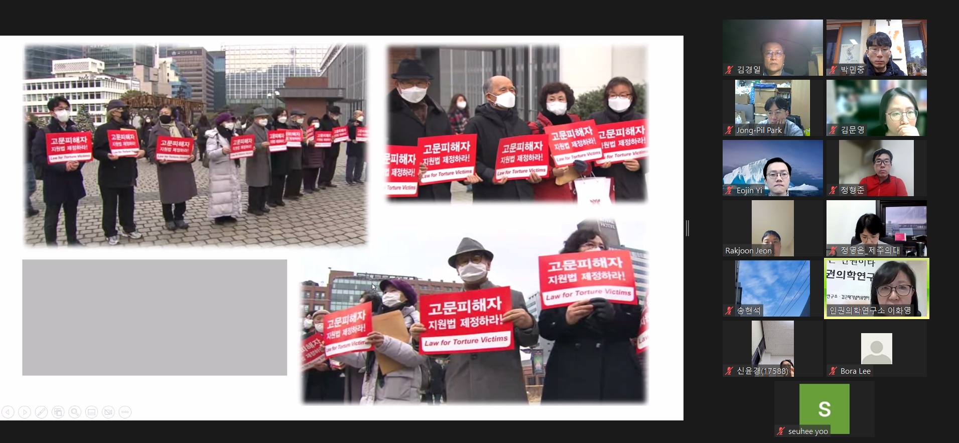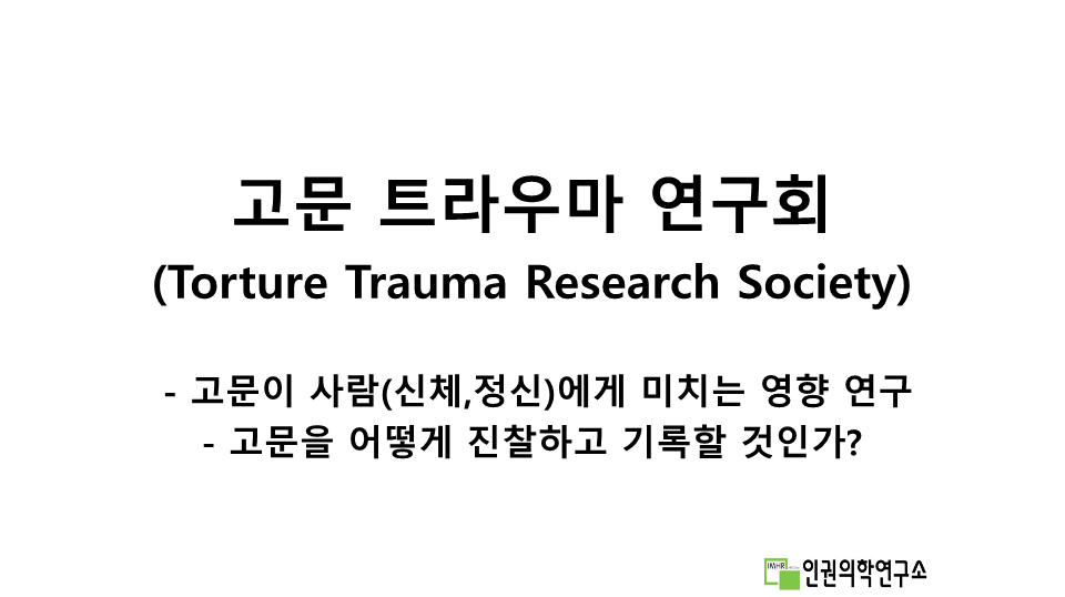 지난 2월 27일 (월) 오후 6시, (사)인권의학연구소에서 “고문트라우마 연구회 Torture Trauma Research Society, TTRS)” 첫 모임을 비대면 줌회의를 통해 개최하였다. 이 연구회는 지난 10년간 국내 고문피해자를 지원해온 인권의학연구소가 향후 사업으로 "고문 트라우마 연구회"의 필요성을 제안하면서 시작되었다.