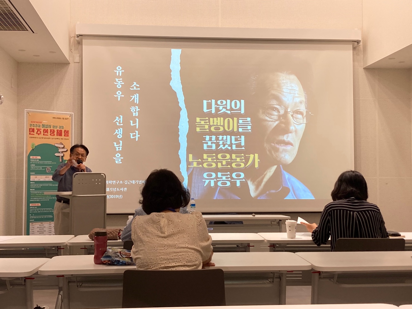 첫 번째로 진행된 이론교육의 강사는 유동우 남영동 민주인권기념관의 보안 관리소장이었다. 유동우 관리소장은 금요일 예정된 서대문형무소의 역사적 배경을 기반으로 대한민국 근현대사에 대한 열띤 강의를 해주었다. 특히 유동우 관리소장은 수강생들을 위해 직접 교안을 작성 및 출력해 나눠주며 한반도의 독립과 대한민국의 민주화 과정에 대한 살아있는 강의를 2시간 동안 이어나갔다. 유동우 관리소장에 따르면 서대문형무소는 다른 현장과 달리 ‘독립’과 ‘민주’라는 키워드가 모두 내재화되어 있으며, 일반 시민들이 단순히 독립이라는 키워드만을 가지고 접근하는 문제점에 대해 설명했다. 1970-80년대 대한민국의 민주화를 설명하는 과정에서 유동우 관리소장은 당시 그 역사 현장에서 자신의 경험담을 녹여내 단순히 활자로 전하는 강의가 아닌 삶으로 전달하는 강의를 들려주었다.