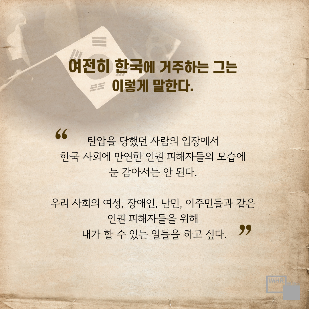 “탄압을 당했던 사람의 입장에서 한국 사회에 만연한 인권 피해자들의 모습에 눈 감아서는 안 된다. 우리 사회의 여성, 장애인, 난민, 이주민들과 같은 인권 피해자들을 위해 내가 할 수 있는 일들을 하고 싶다.”