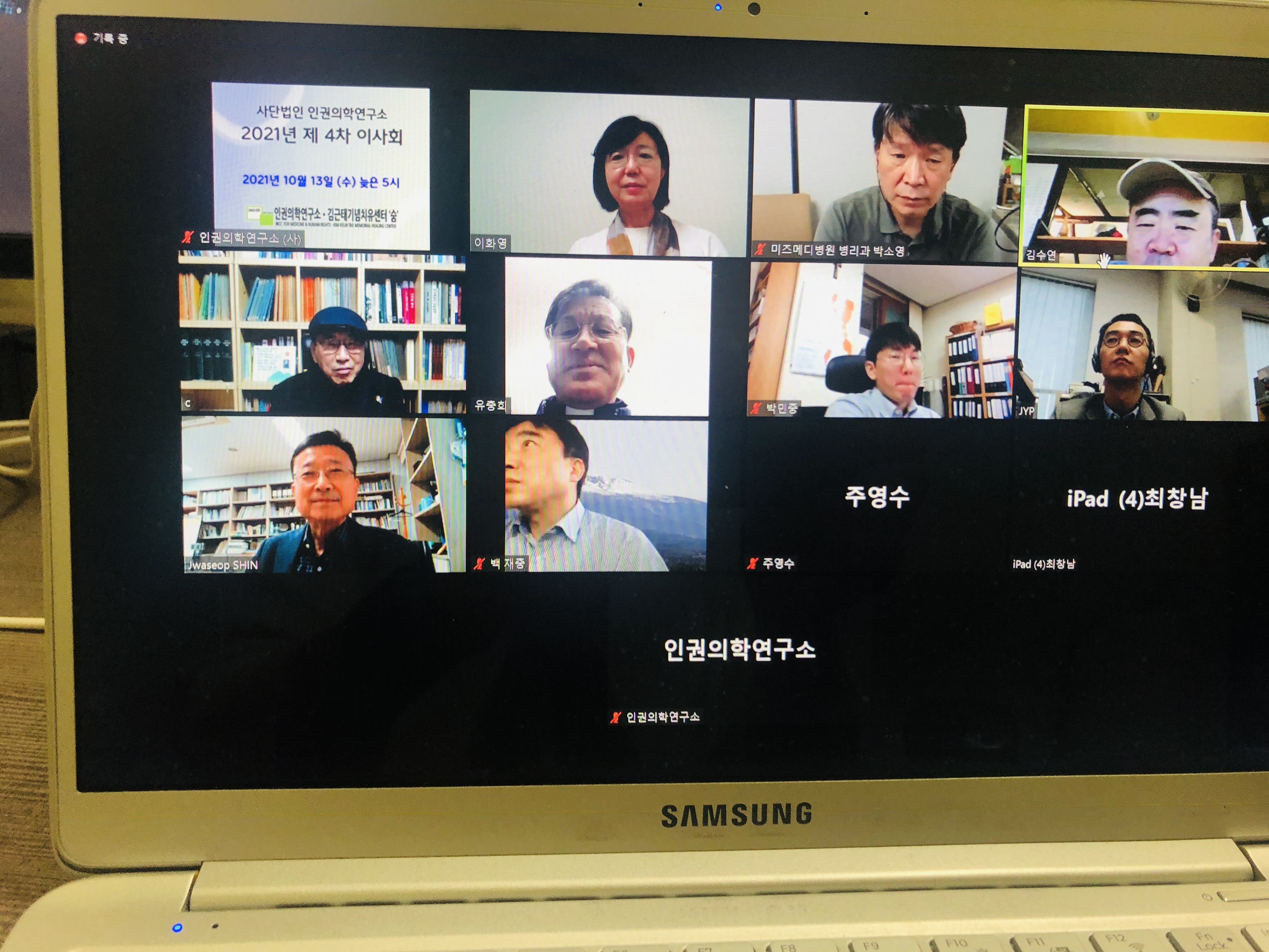 지난 10월 13일 (수) 오후 5시, 인권의학연구소는 제4차 정기이사회를 온라인 줌회의로 개최하였다. 코로나-19 4차 대유행 상황이 지속되면서 지난 제3차 이사회에 이어 현장 회의 대신 온라인 회의방식을 결정하였다. 이날 이사회에는 함세웅 이사장, 이화영 상임이사, 박재영 이사, 백재중 이사, 손창호 이사, 유충희 이사, 신좌섭 이사, 주영수 이사, 최창남 이사가 참석하였다.
