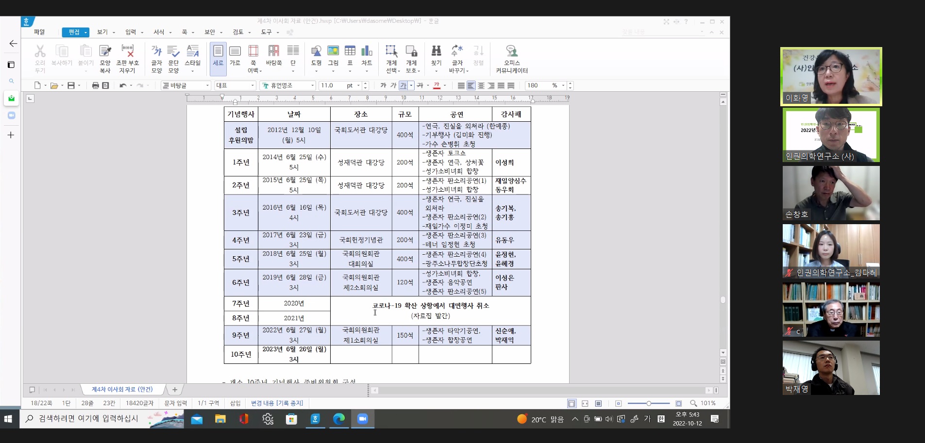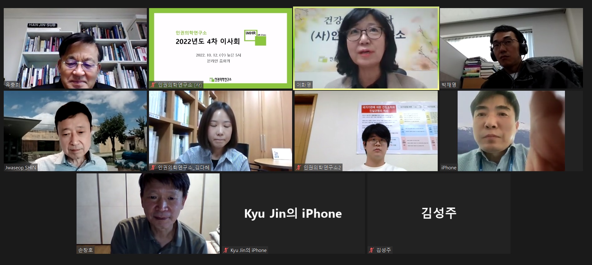 지난 10월 12일 (수) 오후 5시, (사)인권의학연구소는 제4차 정기이사회를 온라인 줌회의로 개최하였다. 지난 제3차 이사회는 현장 회의로 진행했으나, 코로나-19 확산 상황이 지속되면서 비대면 회의 방식을 결정하였다. 이날 이사회에는 함세웅 이사장, 이화영 상임이사, 박재영 이사, 백재중 이사, 손창호 이사, 유충희 이사, 신좌섭 이사, 김성주 감사, 최규진 감사가 참석하였다. 이사회 개회에 앞서 임원진의 근황 소개를 통해 신좌섭 이사의 서울대학교 의학교육연수원장 취임과 최창남 이사의 ‘신들의 땅’ 서적 출간을 축하하는 시간을 가졌다.
