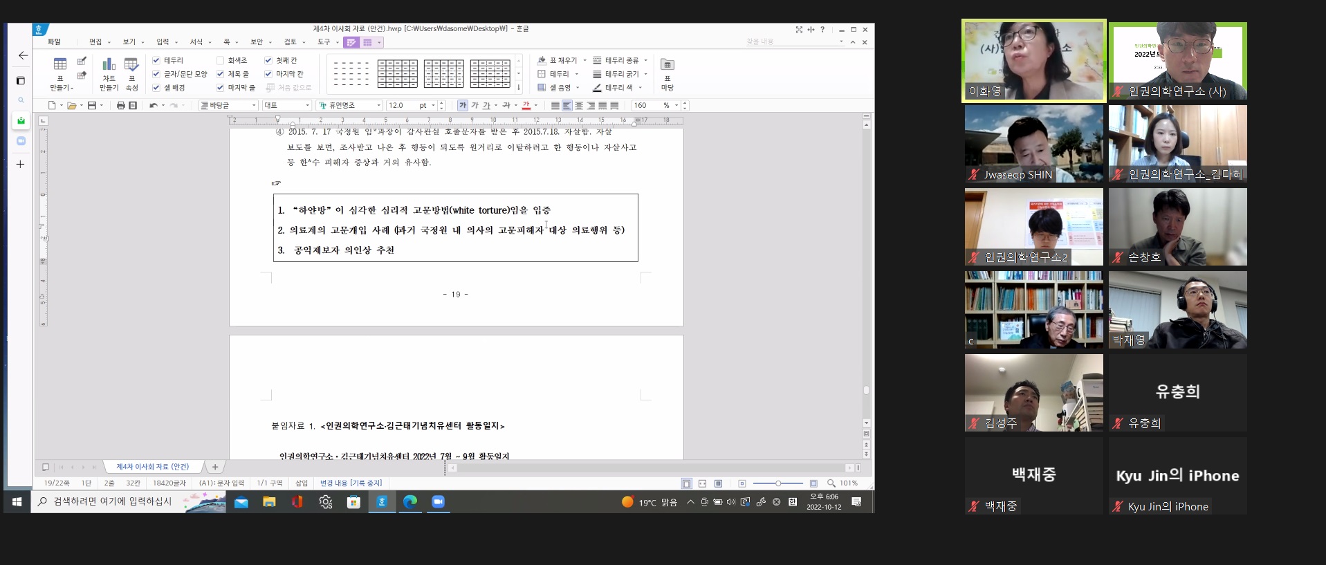 <사진1. 줌회의로 개최한 인권의학연구소 제4차 이사회 (10.12)>