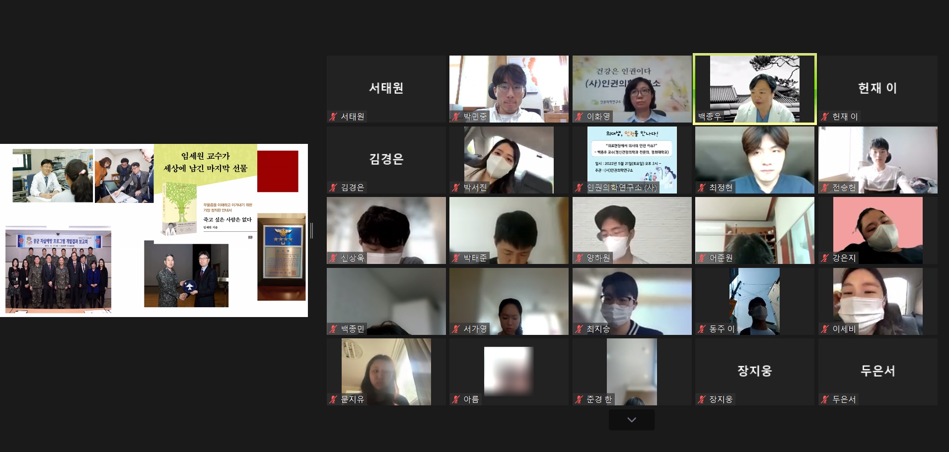 그러나, 월례강좌를 통해 의료인과 예비의료인들의 자발적 참여와 인권감수성 증진을 위한 논의의 장을 제공하는 의미는 여전히 중요하다. 6월 강좌는 “노동자의 건강권”을 주제로 공유정옥 선생님이 6월 11일(토)에 진행할 예정이다.