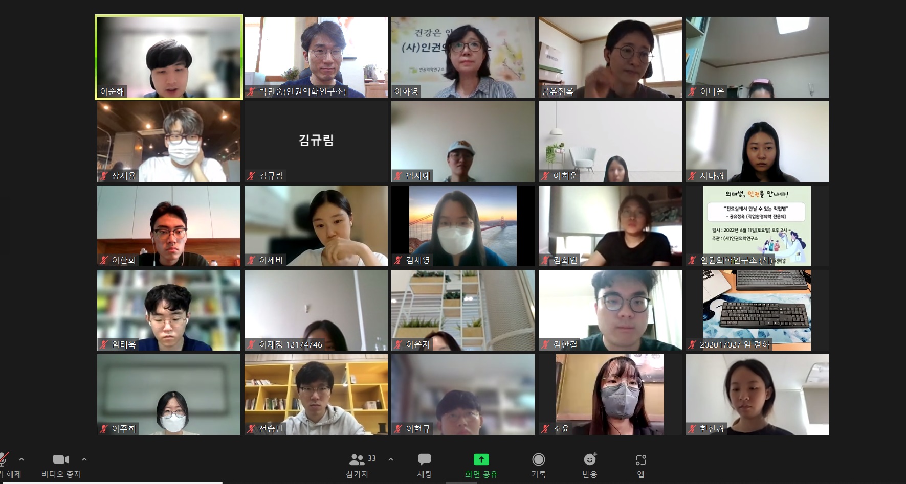 6월 인권 강좌도 비대면 줌회의로 진행하였으나, 대부분의 참여 학생은 실시간 소통을 위해 비디오 온(ON)으로 강의에 참여하였다. 강의 후 채팅창 대신 실시간으로 직접 질문을 받고 대답하는 방식을 취하였다. 예상보다 긴 시간동안 질문과 대답이 지속되는 열의가 느껴진 강의였다. 월례강좌를 통해 의료인과 예비의료인들의 자발적 참여와 인권감수성 증진을 위한 논의의 장을 제공하고자 하는 인권의학연구소의 노력은 계속될 것이다.