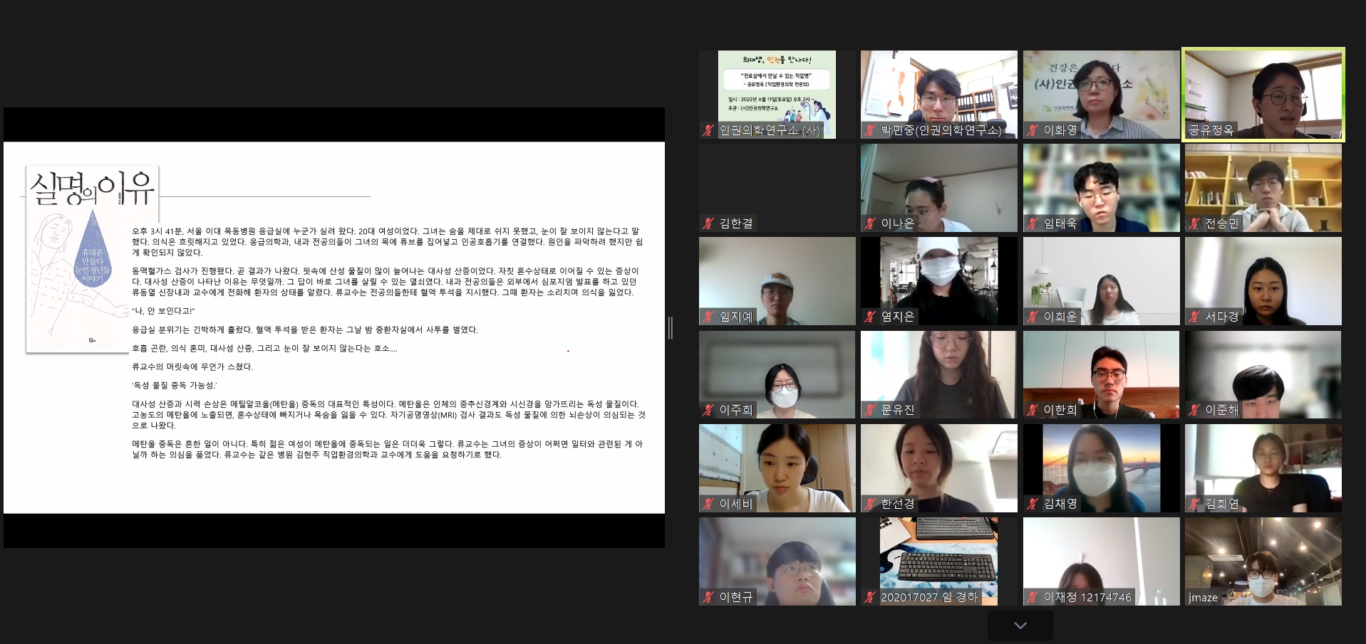 6월 인권 강좌도 비대면 줌회의로 진행하였으나, 대부분의 참여 학생은 실시간 소통을 위해 비디오 온(ON)으로 강의에 참여하였다. 강의 후 채팅창 대신 실시간으로 직접 질문을 받고 대답하는 방식을 취하였다. 예상보다 긴 시간동안 질문과 대답이 지속되는 열의가 느껴진 강의였다. 월례강좌를 통해 의료인과 예비의료인들의 자발적 참여와 인권감수성 증진을 위한 논의의 장을 제공하고자 하는 인권의학연구소의 노력은 계속될 것이다.