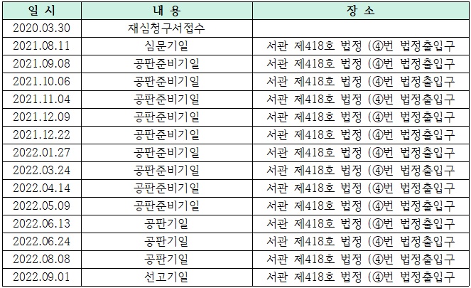 이번 재심은 40여 년을 가슴에 묻고 지내던 유가족들이 지난 2020년 3월 30일 재심을 청구하면서 시작되었다. 비록 아버지 김재민과 어머니 이포례는 고인이 되었지만, 유가족들이 잘못된 역사를 바로잡기 위해 용기를 내었다. 이 재심 청구에 대해 사법부는 2021년 9월 8일, 당시 “재심대상사건의 수사에 관여한 경찰관들은 피고인들을 피의자동행이라는 명목으로 강제로 연행하여 구속영장 발부 없이 구금하다가 내무부 치안본부로 인계하였고, 치안본부는 구금일로부터 24일 또는 28일 후에야 비로소 구속영장을 발부받아 집행하였다”는 점을 지적하며, “이와 같은 수사기관의 인신구속은 적법절차를 위반하여 긴급구속의 절차를 밟지 않고 피고인들을 불법으로 구금한 것”으로 판단하며 재심 개시가 결정되었다. 지난 9월 1일, 무죄 선고를 받기까지 총 8차례의 공판준비기일이 있었으며, 총 3차례의 공판이 진행되었다. (아래 <표-1> 사건일지 참고)