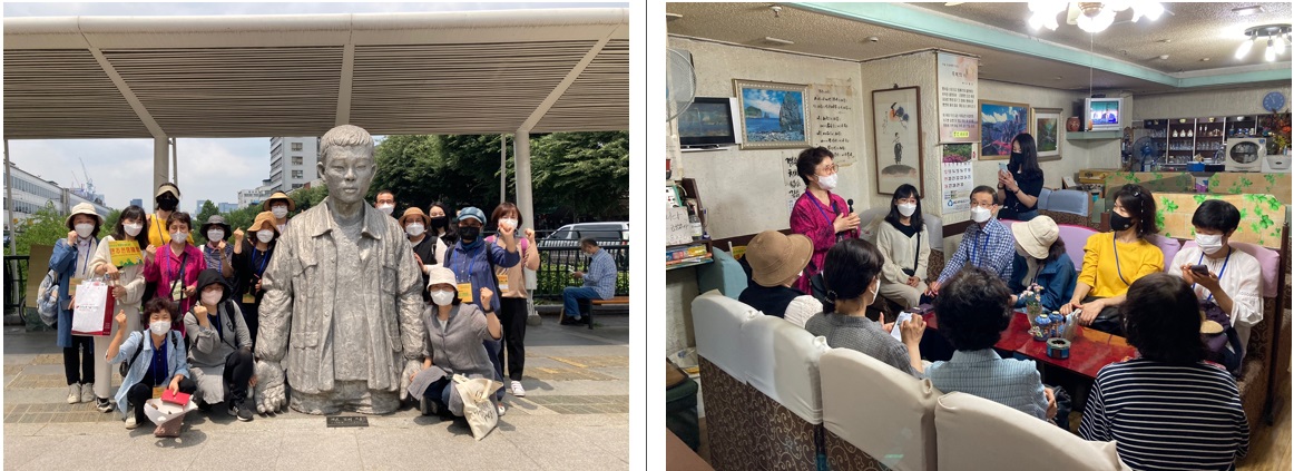 이러한 맥락에서 이숙희 선생은 청년 전태일의 삶과 한국 사회의 노동이 무엇을 의미하는지 강의를 이어나갔다. 이론교육 후 전태일기념관에서 진행된 현장교육은 당시 전태일, 이소선 여사의 다양한 유품들을 보며 몰입감 있는 교육이 되었다. 전태일기념관에서 1972년 청계피복의 노동조합에 가입한 이후 1975년까지 노동자들의 근로조건 개선을 위해 싸웠던 이숙희 선생의 당시 노동현장도 엿볼 수 있었다. 그곳에서 지금은 너무도 당연해진 노동환경 개선을 위해 투쟁했던 10대 이숙희 선생과 같은 수많은 노동자들의 헌신을 상상할 수 있었다. 그리고 전태일기념관을 나와 청계천을 따라 전태일 다리, 그리고 1960년대 전태일이 자주 갔던 다방에 모두 가서 쌍화차를 마시며 두 번째 현장교육은 마무리되었다.