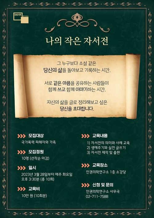 스마트폰 시간에는 참여자들이 서로 알려주며 1시간이 어떻게 지나가는지 모를 정도로 열기가 뜨겁다. 혈기도 수업과 스마트폰 수업이 끝나고 고령의 참여자들은 피곤할 법도 한데, 그다음 시간을 준비한다. 마지막 시간은 ‘나의 작은 자서전’ 시간이다. 이 시간은 그 누구보다 소설 같은 삶을 살았고, 지금도 그 삶을 살아가고 있는 참여자들의 인생을 스스로 정리해 보는 시간이다. 다른 곳에서는 이야기하기 어려울 수 있지만, 서로 같은 아픔을 공유하고 있는 이들은 인권의학연구소에서 그 삶을 기록하고자 한다. 연구소에서 처음 이 프로그램을 준비하고 국가폭력 피해당사자와 그 가족들에게 안내했을 때, ‘자서전이라는 건 유명한 사람들이나 쓰는 것이지 우리 같은 사람들이 뭐 쓸게 있냐’며 난색을 표하기도 했다.