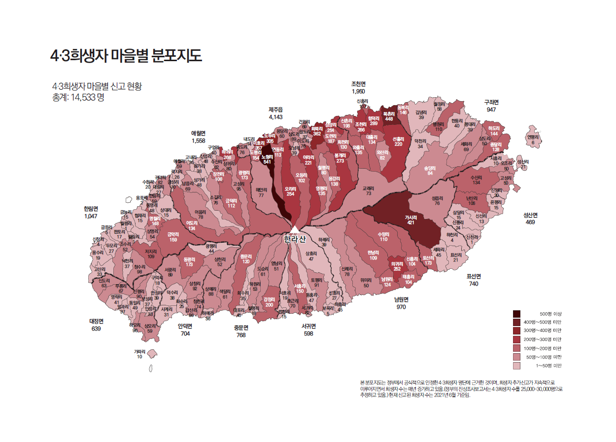속숨허지 않고 숨을 내쉬고 말을 내뱉을 수 있기까지 많은 분들의 노력이 있었습니다. 살아내고 바라냄으로써, 기억을 잊지 않고 이음으로써 오늘날 많은 이들이 제주 4.3을 잊지 않고 기억하게 되었습니다. 이들의 노력은 그치지 않고 또 다른 국가폭력인 ‘간첩조작사건’으로 이어졌습니다. 제주도의회가 민의를 반영해 공포한 ‘제주도 간첩 조작사건 피해자 등의 명예회복 및 지원에 관한 조례’에 따라, 지난 해 제주도에서는 ‘간첩조작사건 피해실태 조사보고서’가 나왔습니다. 제주도는 이달부터 2차 실태 조사를 진행해 추가 피해자를 찾고, 지원방안을 마련하고 있습니다. 제주도는 참혹한 폭력과 학살의 현장이었던 수탈의 땅에서 희망과 바람을 담은 평화의 섬으로 나아가고 있습니다.