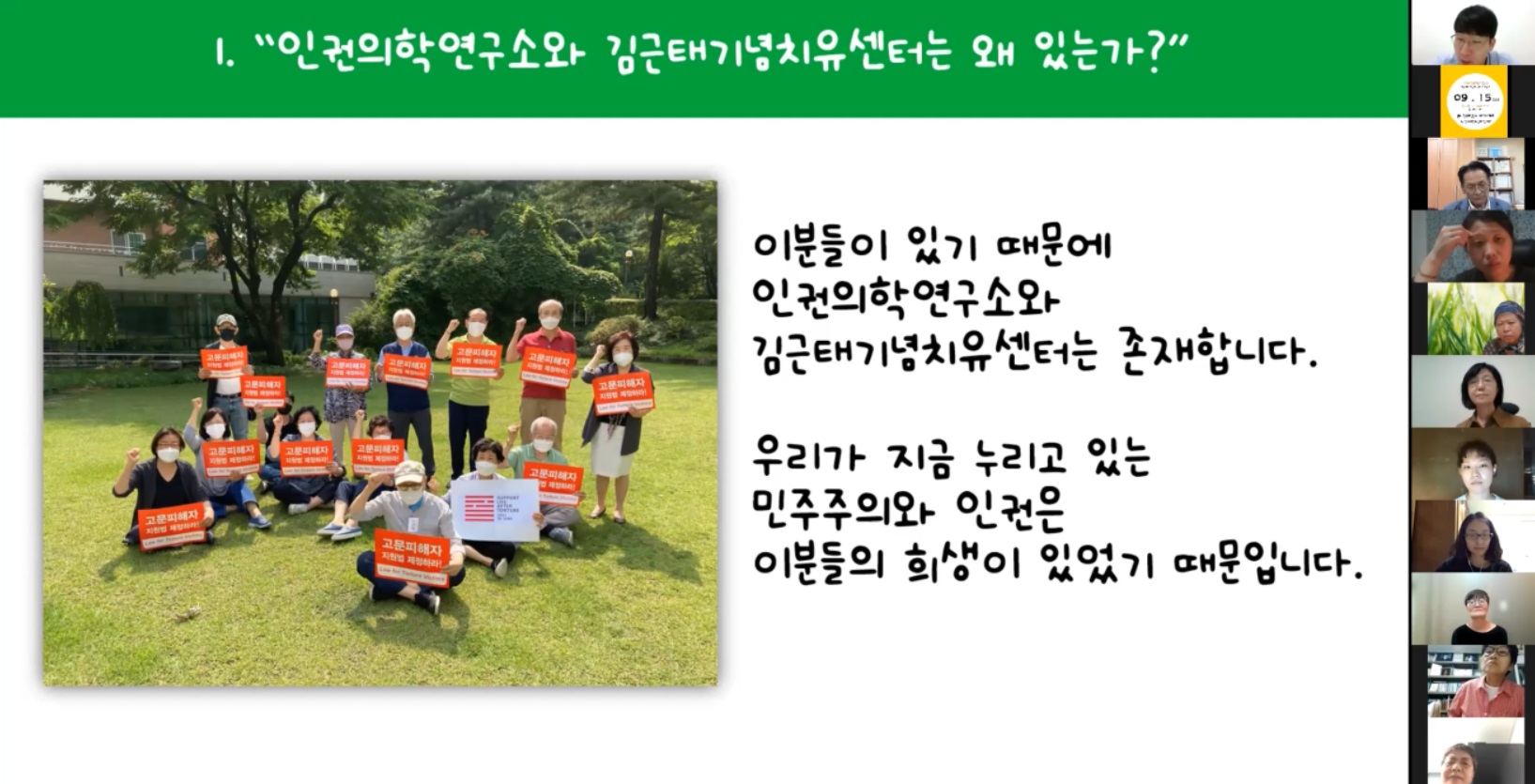 서로 안부를 물으며 시작한 행사는 먼저 사무국에서 신규 후원회원들을 위해 인권의학연구소·김근태기념치유센터의 정체성과 역할을 공유했다. 특히 지금 우리가 누리고 있는 민주주의와 인권이 국가폭력 피해 생존자들의 희생이 있었기 때문이며, 이분들의 삶이 원상회복되는 것이 연구소의 가장 중요한 목표임을 다시금 기억하는 계기가 되었다. 연구소가 후원회원의 후원과 참여로 운영되는 비영리 민간 연구소라는 점을 고려할 때, 앞으로 이 같은 소통의 장은 지속될 필요가 있다.