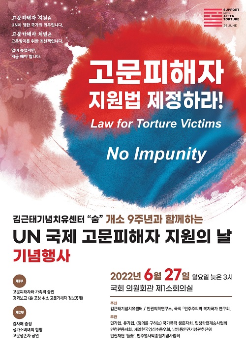 3년 만에 열립니다. 코로나로 인해 하지 못했던 “국제 고문피해자 지원의 날” 기념행사를 오는 6월 27일(월) 오후 3시 국회에서 진행합니다. 이번 행사는 김근태기념치유센터“숨”의 개소 9주년을 맞아 다시 한번 우리 사회의 고문피해자와 그 가족으로 살아가고 있는 분들을 기억하고자 합니다. 동시에 우리 사회가 그분들을 위해 무엇을 해야 하는지 분명하게 천명하는 자리가 될 예정입니다. 국회 의원회관 제1소회의실에서 열리는 이번 기념행사는 김근태기념치유센터·(사)인권의학연구소와 국회 『민주주의와 복지국가 연구회』가 공동으로 주최하며 9개의 주관단체들이 함께 참여합니다.