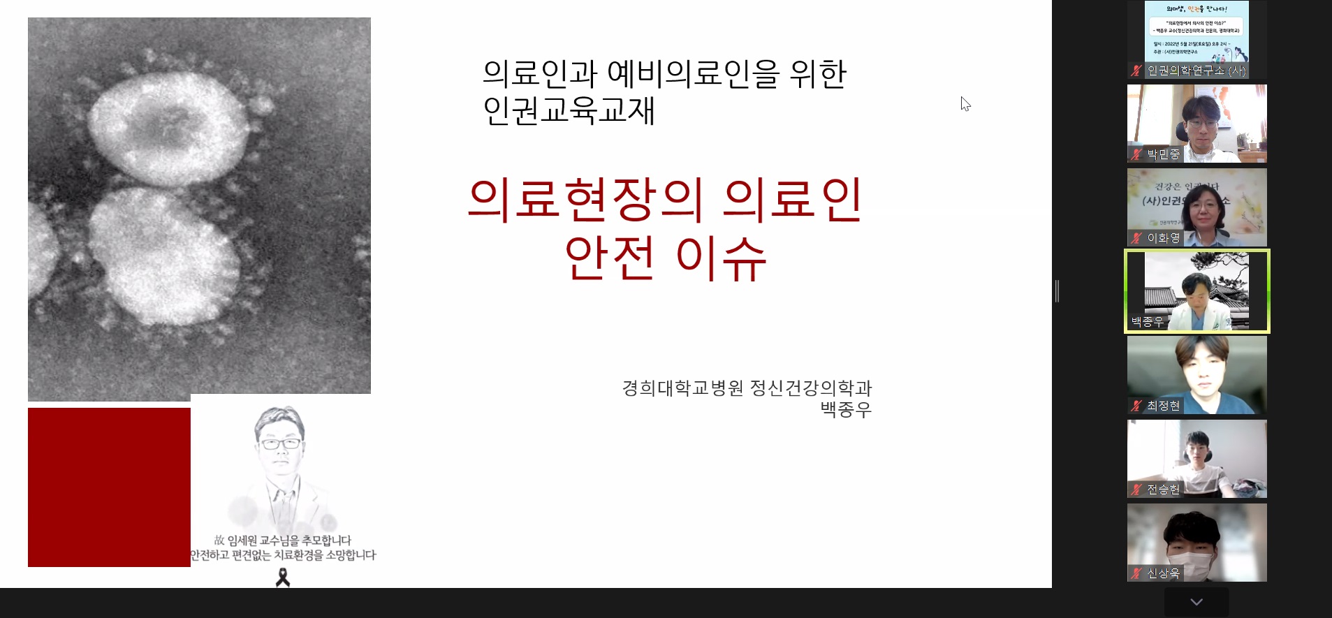 제 2강좌는 5월 21일 (토) 오후 2시에 비대면 줌회의로 진행하였는데, 환자와 의사를 위한 안전한 의료환경을 다루는 “의료현장에서 의사의 안전 이슈 ” 제목으로 백종우 경희대학교 교수가 진행하였다. 강의 중에 고 임세원 교수의 사례를 통해 응급실뿐 아니라 외래 진료실도 의료인에게 위험한 현장이 될 수 있으며, 의료인 자신들의 자살 사고나 시도의 현황을 확인하면서 의료인 안전을 확보하기 위한 대책을 함께 공유하였다. 한 참여자는 주변 지인이나 친구 중에 자살 생각이 있거나 극심한 우울증에 시달리는 경우, 학생으로서 무엇을 할 수 있겠느냐고 질문하였고, 정신건강상담전화(1577-0199)의 연결을 제시하였다.